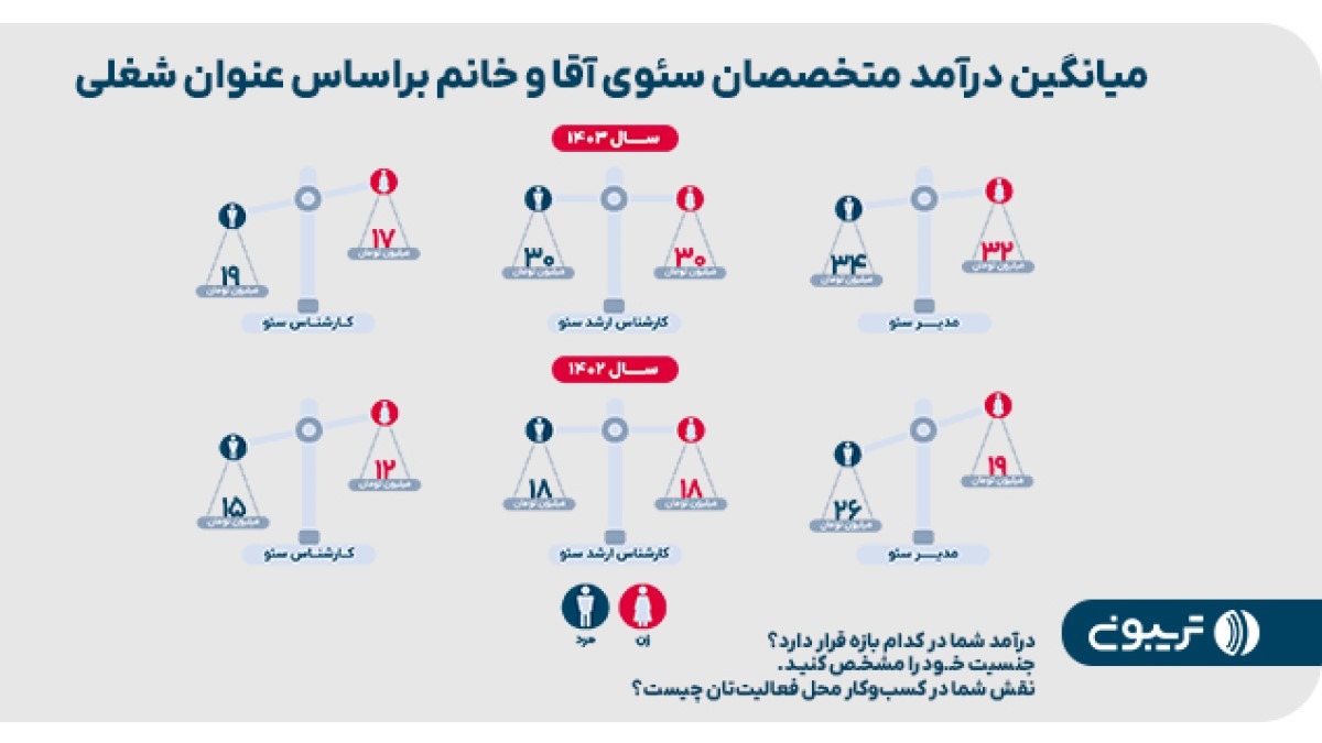 میانگین درآمد ماهانه متخصصان سئو در سال ۱۴۰۳ برابر ۲۹میلیون تومان بوده است. نزدیک به ۲۰درصد متخصصان سئو در سال ۱۴۰۳ بالای ۵۰میلیون تومان در ماه درآمد داشتهاند. در سال گذشته، میانگین درآمد ماهانه مدیران سئوی آقا و خانم بهترتیب ۳۴ و ۳۲میلیون تومان، میانگین درآمد ماهانه کارشناسان ارشد سئوی آقا و خانم بهشکل یکسان ۳۰میلیون تومان و میانگین درآمد ماهانه کارشناسان سئوی آقا و خانم ۱۹ و ۱۷میلیون تومان بوده است. همچنین، میانگین درآمد متخصصان سئوی یکشغله، دوشغله و سهشغله در سال ۱۴۰۳ بهترتیب ۲۷، ۲۹ و ۳۶میلیون تومان بوده است.