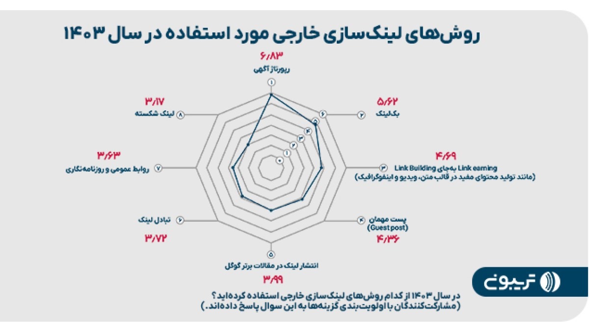 آنان موثرترین روشهای لینکسازی خارجی در سال ۱۴۰۳ را بهترتیب «انتشار رپورتاژ آگاهی بدون تگ تبلیغاتی»، «انتشار رپورتاژ آگهی با تگ تبلیغاتی»، «لینکسازی لایهای»، «Link earning بهجای Link Building (مانند تولید محتوای مفید در قالب متن، ویدیو و اینفوگرافیک)»، «بهروزرسانی رپورتاژها» و «بک لینک سایت واید» دانستهاند.