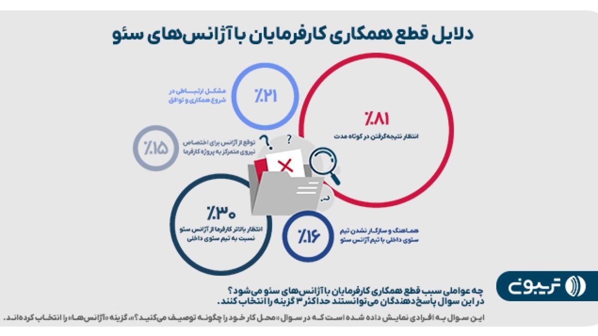 ۵۱درصد از متخصصان سئوی شاغل در آژانسها و فریلنسرها و مشاوران سئو اعلام کردهاند که در سال ۱۴۰۳ بودجه کارفرمایان با افزایش همراه بوده است. در سال ۱۴۰۳ بزرگترین دلیل قطع همکاری کارفرمایان با آژانسهای سئو «انتظار نتیجه گرفتن در کوتاه مدت» و بزرگترین انتظار کارفرمایان از متخصصان سئو «افزایش فروش» بوده است.